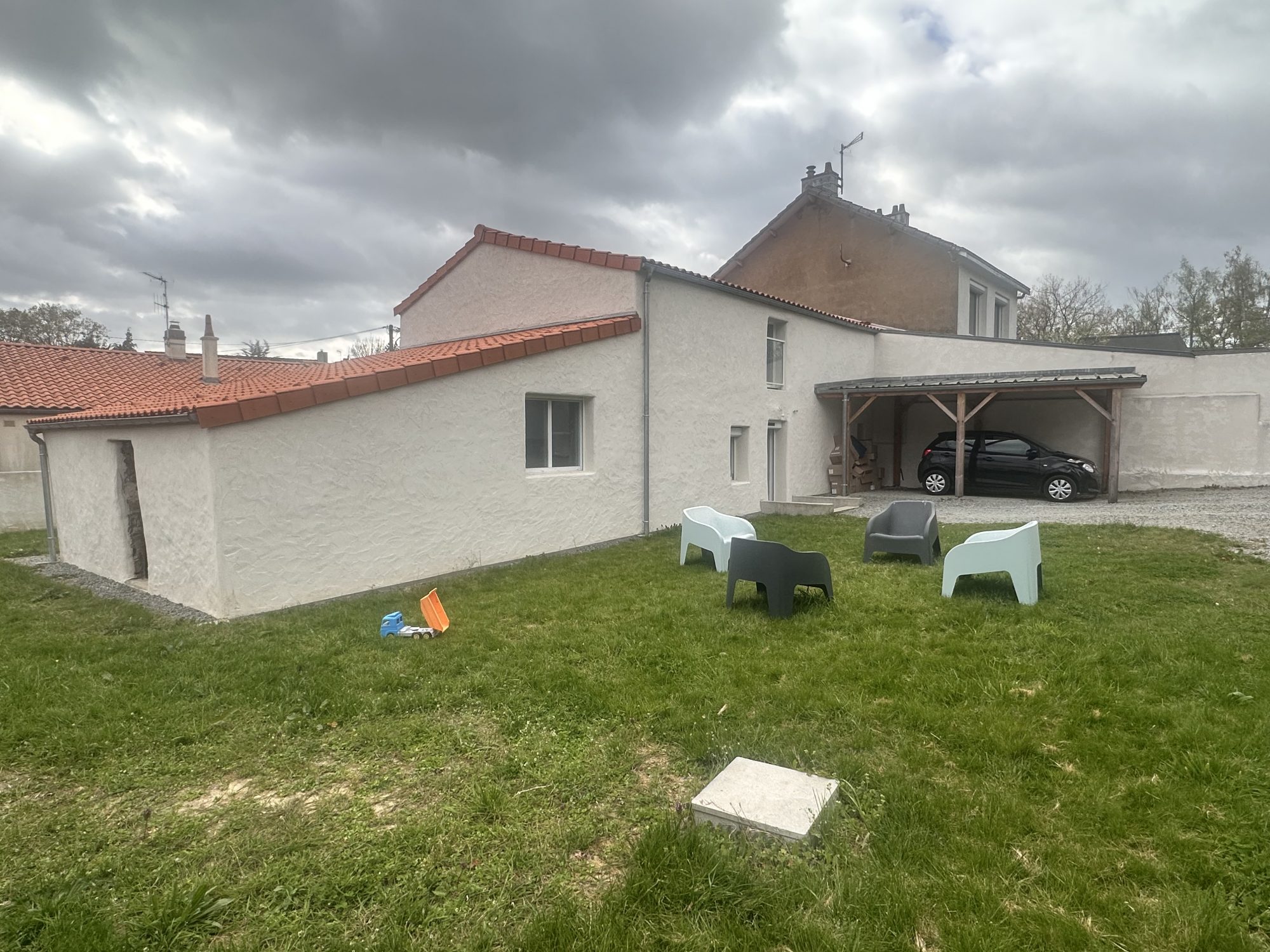 A l'extérieur un carport avec une prise permettant de recharger une voiture électrique accompagné de 2 autres places de parking
