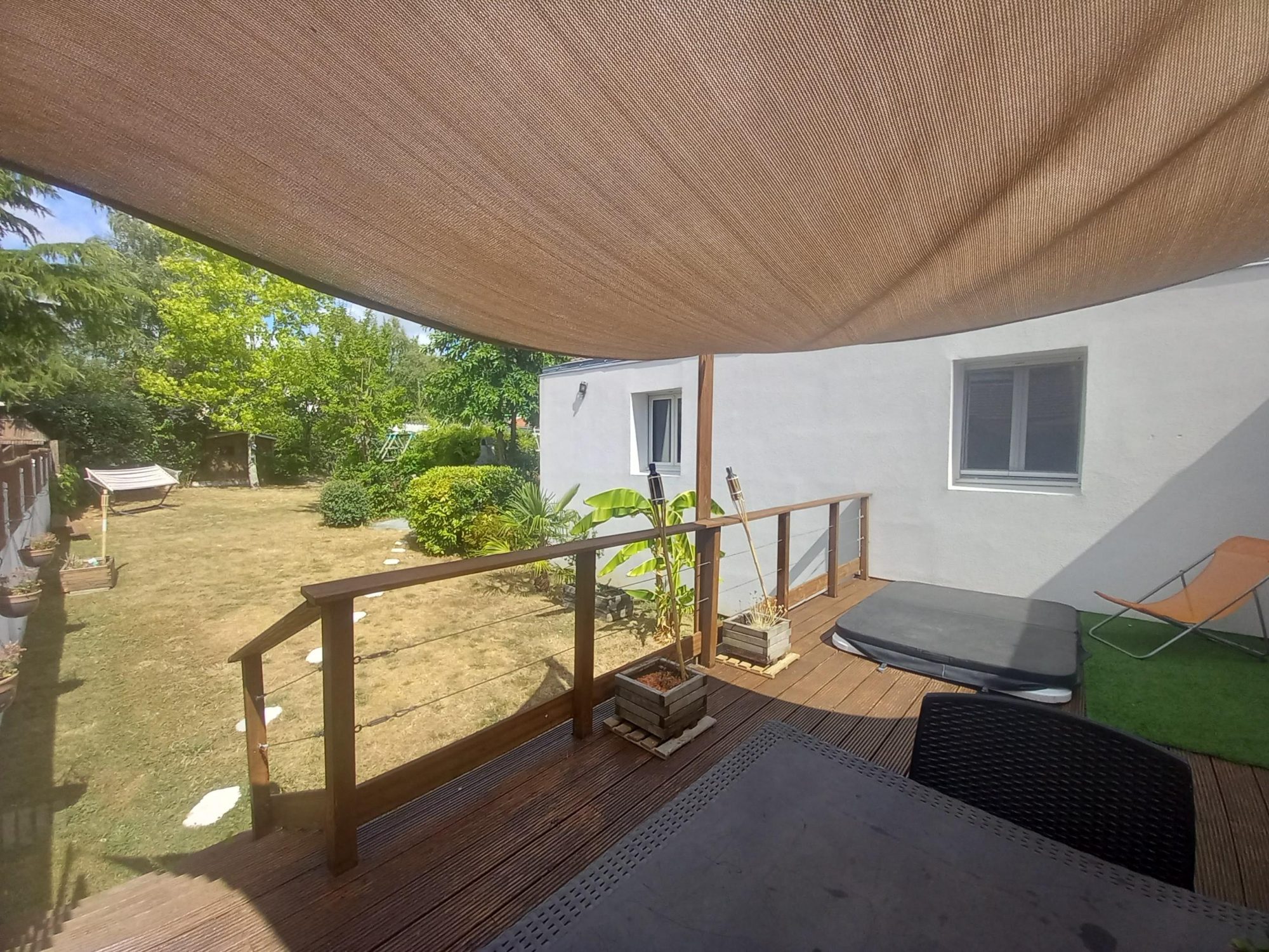 La terrasse intimiste avec jacuzzi est exposée Sud Ouest, cet espace est parfait pour la détente ou les moments en famille ou entre amis!