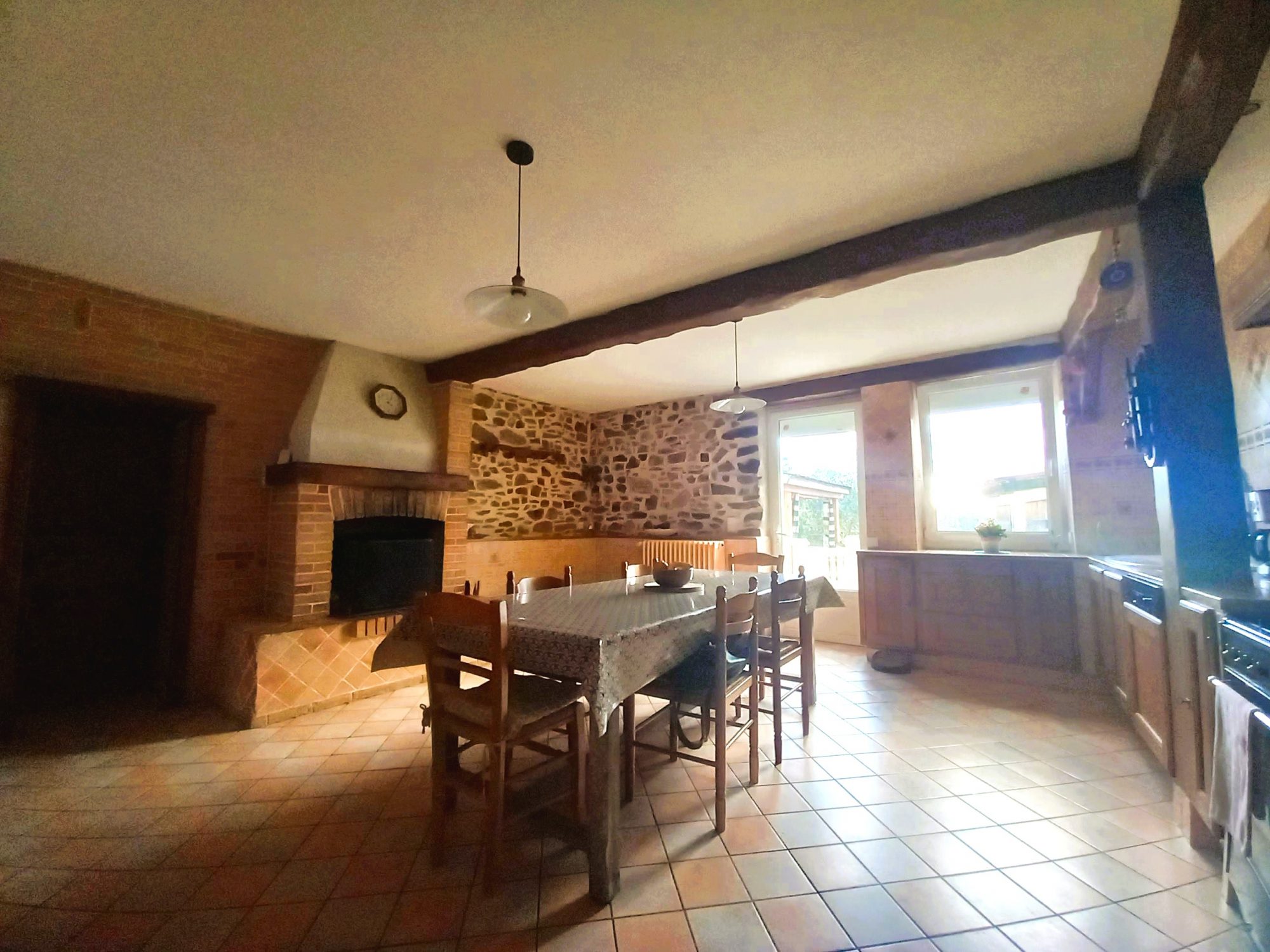 Entrée avec placard, cuisine dînatoire de plus de 25m² avec cheminée idéale pour les cuissons au feu de bois, pièce de vie en deux parties d'environ 36m², chambre ou bureau en rez de chaussée, vaste salle de bains avec douche et baignoire, wc, buanderie. En étage,4 chambres et WC.