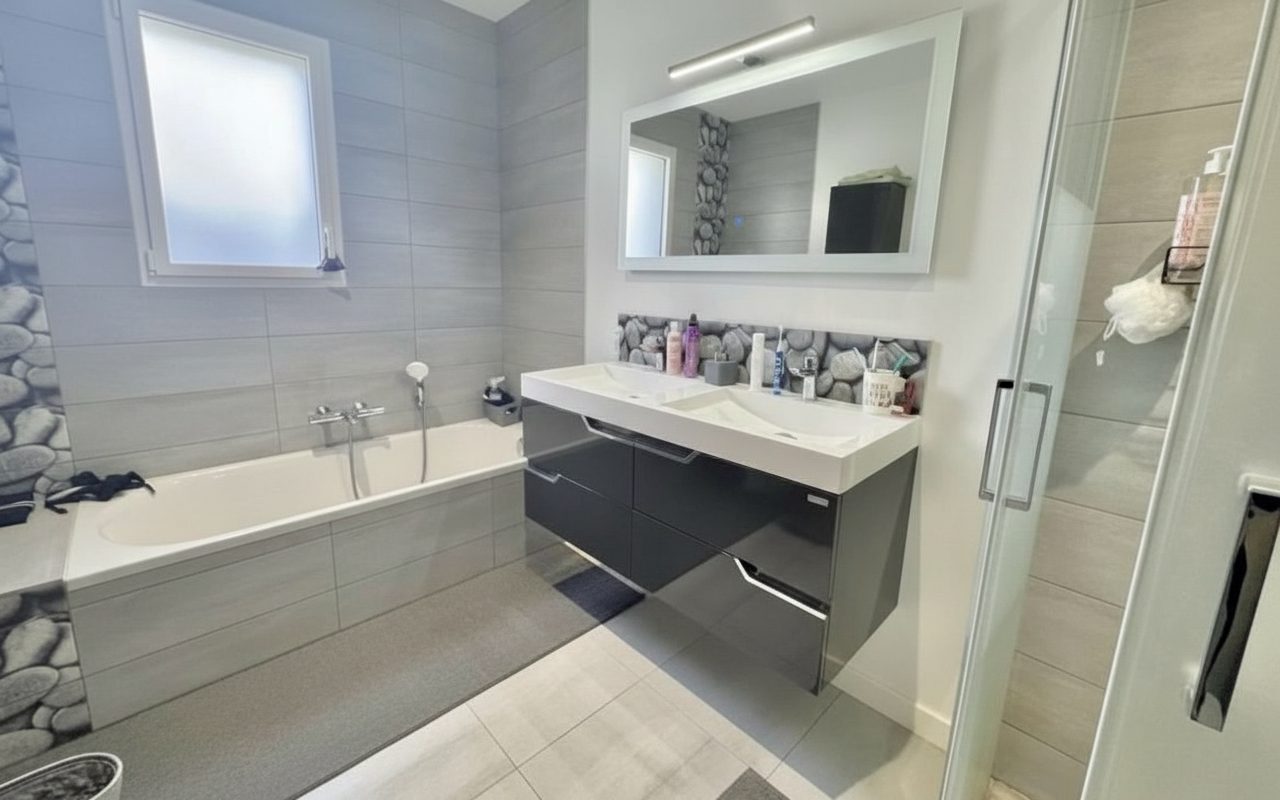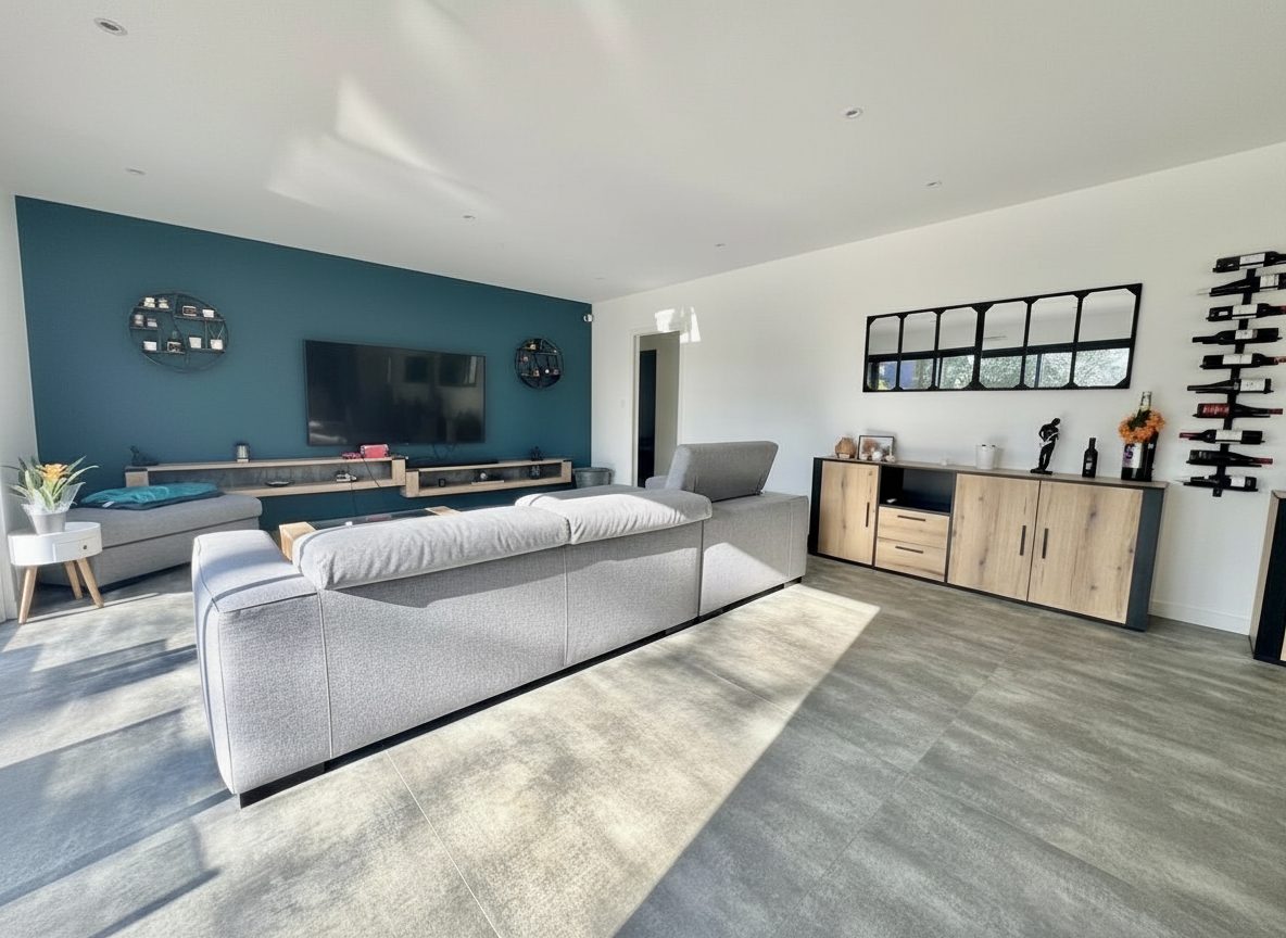 Vous découvrirez une maison contemporaine RT 2020 de plain-pied, construite en 2021, d’une surface d’environ 145 m².