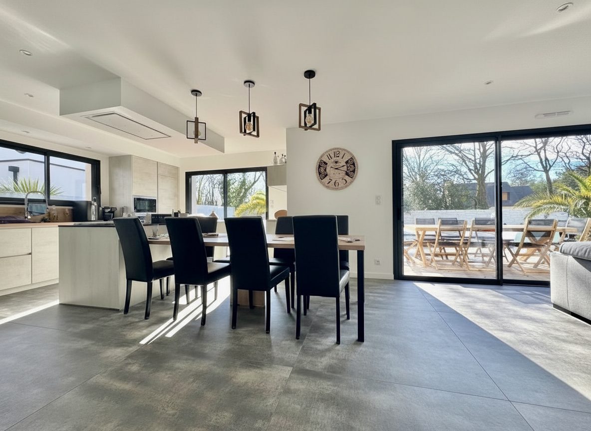 Vous découvrirez une maison contemporaine RT 2020 de plain-pied, construite en 2021, d’une surface d’environ 145 m².