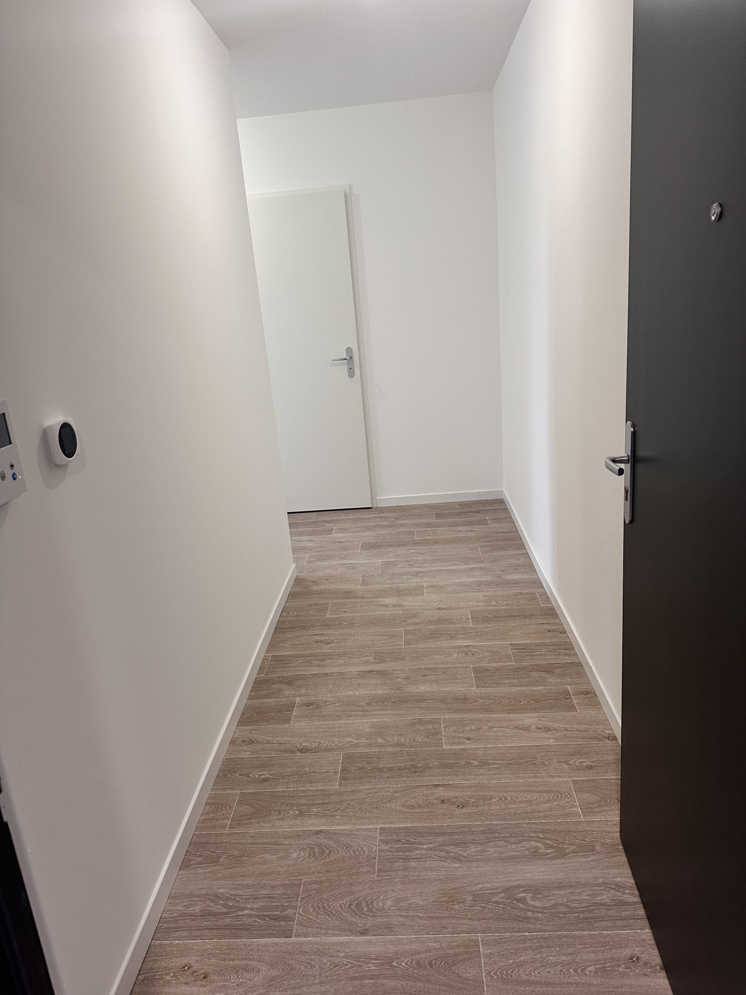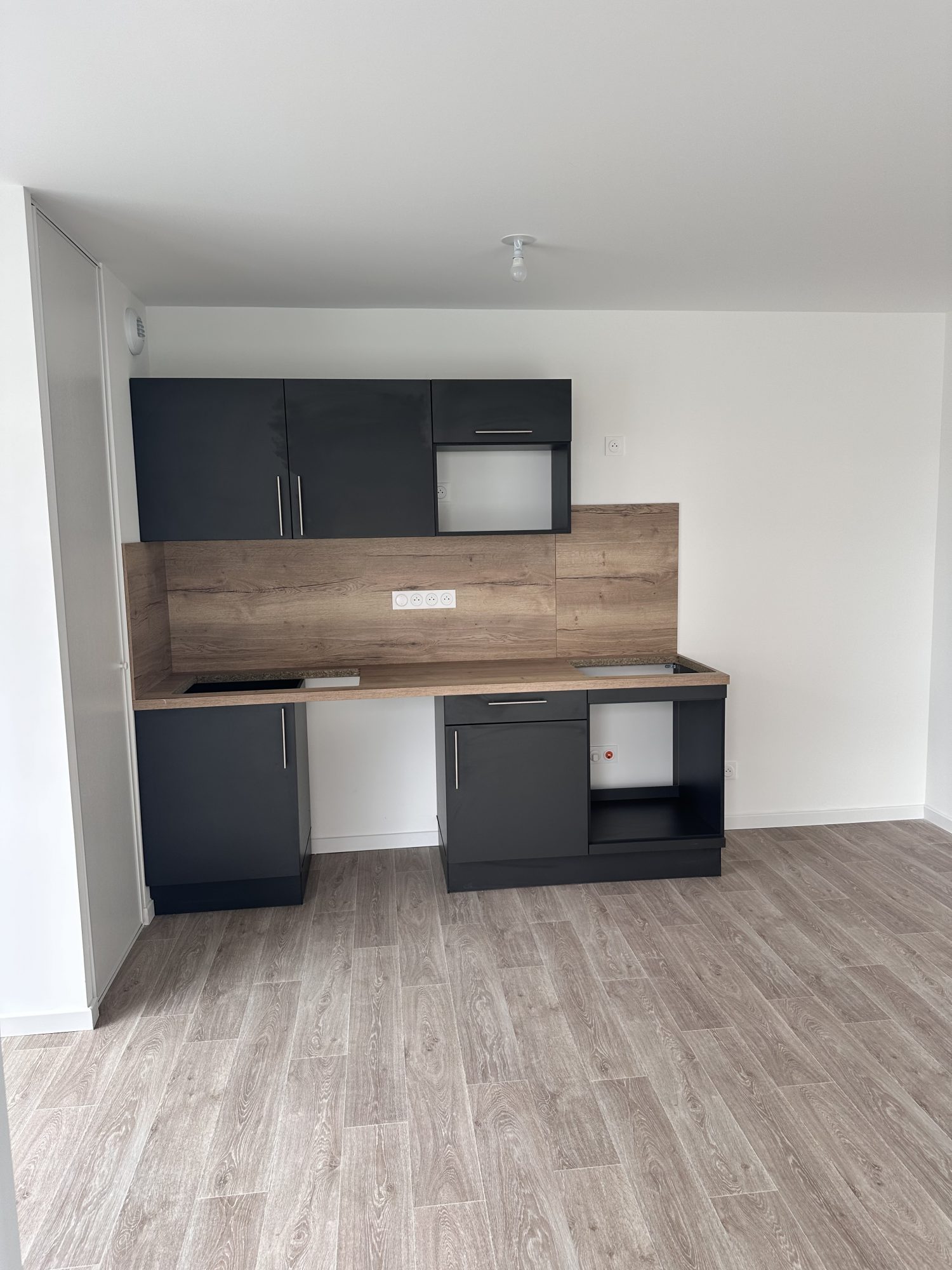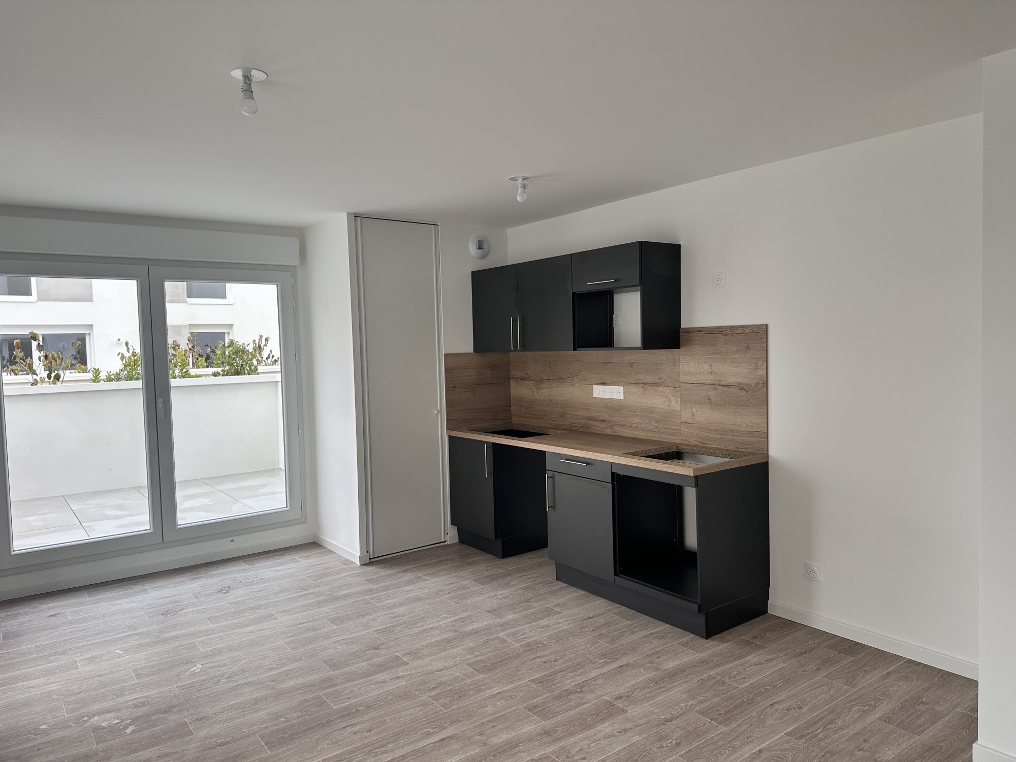 La pièce de vie de 23,81 m² s'ouvre sur un balcon de 8,25 m² et une terrasse de 6 m². La cuisine est entièrement équipée et aménagée (plaques, four et hotte).