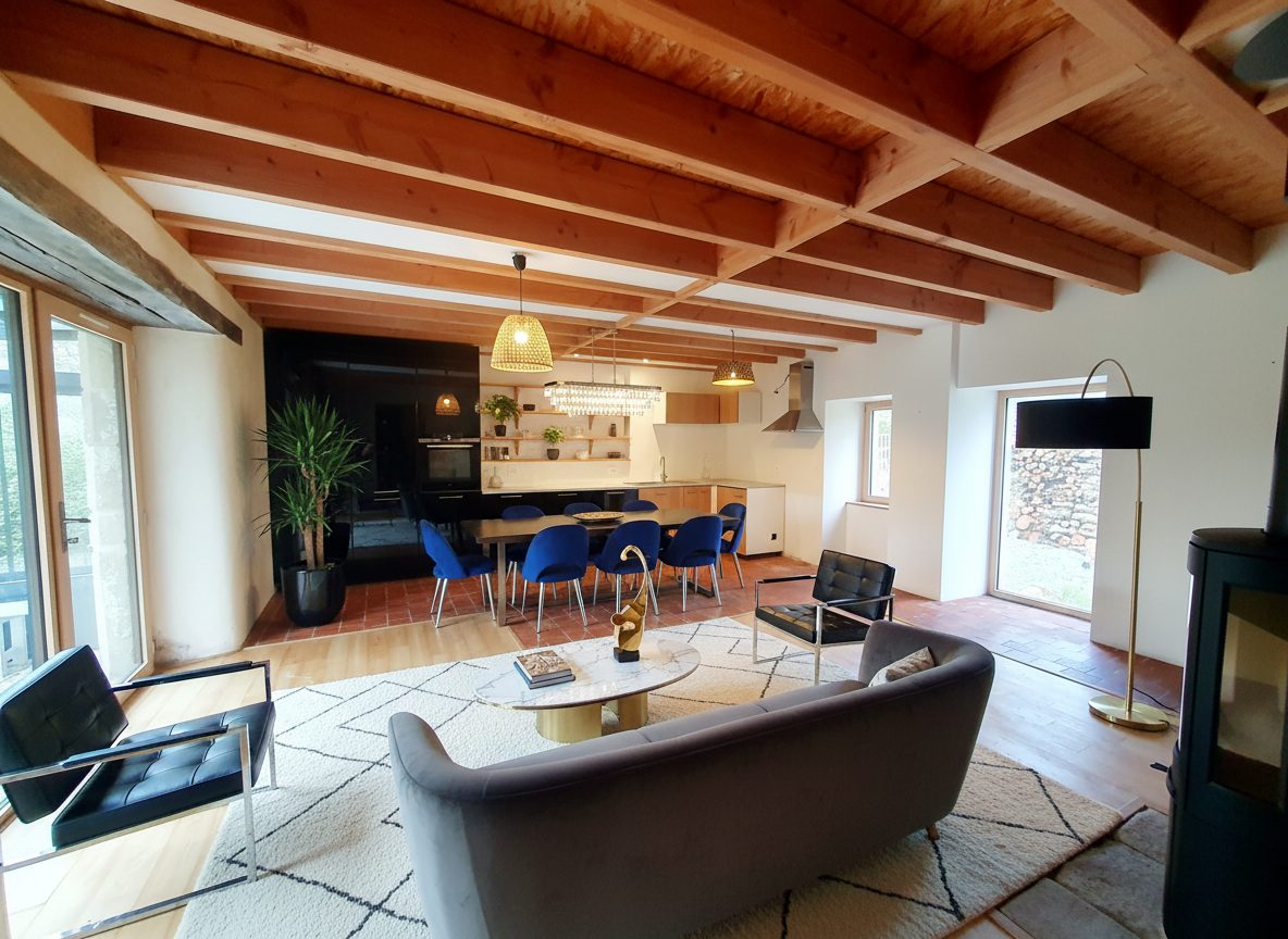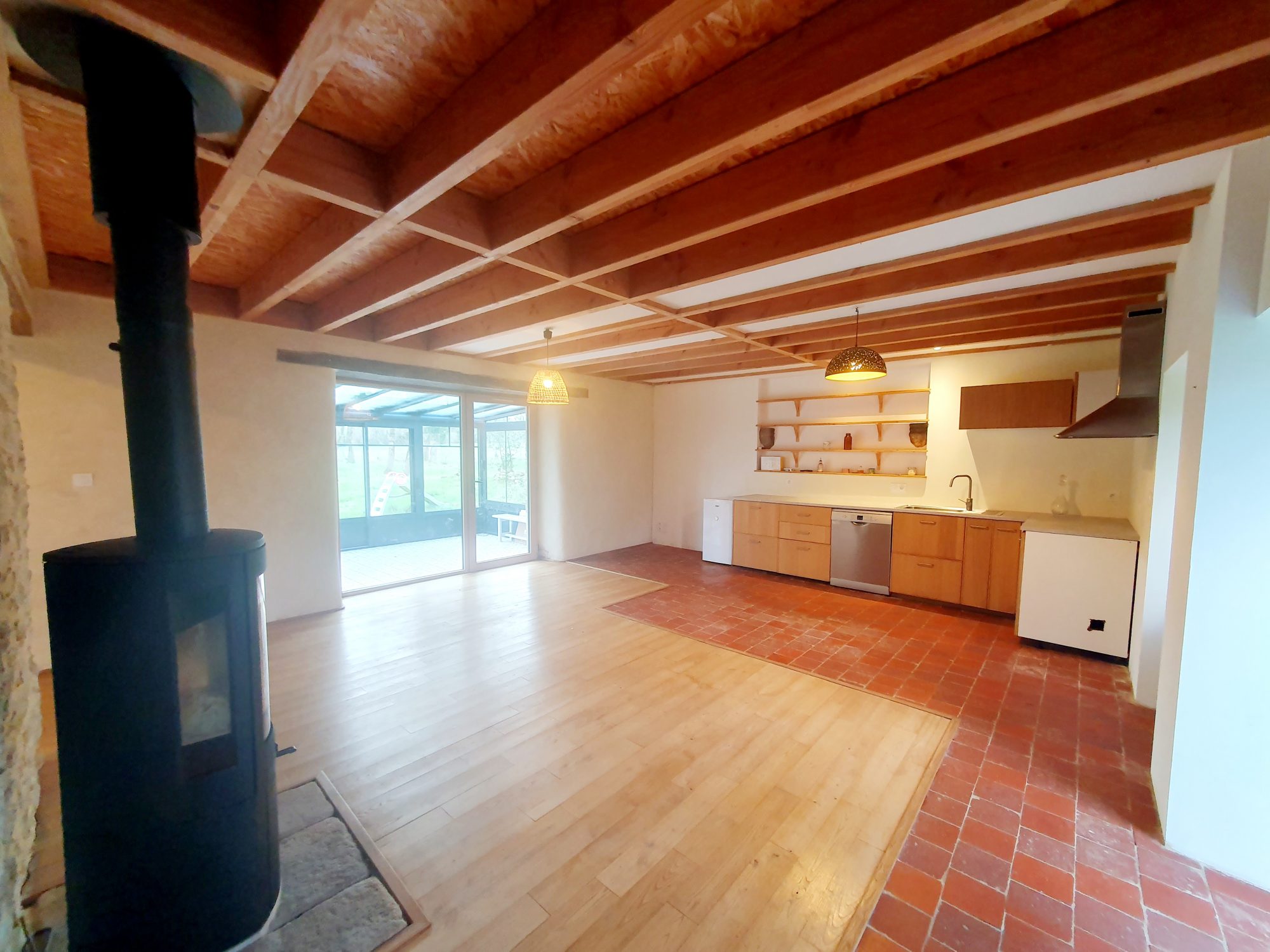 salon/séjour avec poêle à bois, cuisine aménagée et équipée ouverte, une chambre.