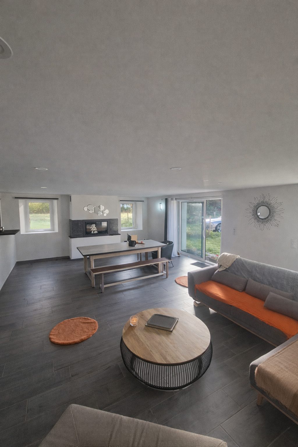 Un vaste salon-séjour lumineux, avec un insert bois,