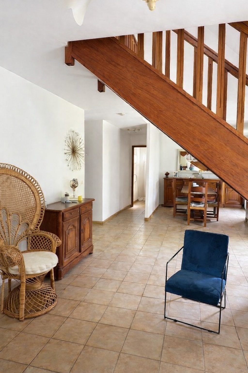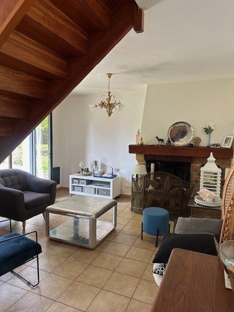 Le séjour, composé d’un salon et d’une salle à manger avec cheminée insert, offre des espaces bien définis, séparés par un escalier, créant une atmosphère conviviale et fonctionnelle.